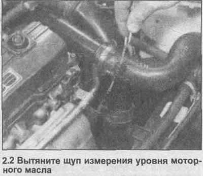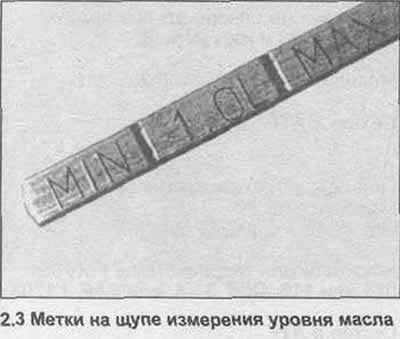 2. Щуп измерения уровня находится на стороне двигателя, обращенной вперед. Извлеките щуп и, используя чистую ветошь, вытрите масло (см. иллюстрацию). Вставьте щуп в трубку, насколько это возможно, затем извлеките его снова.