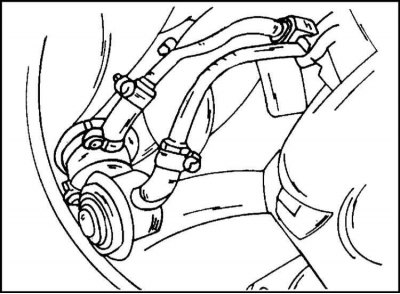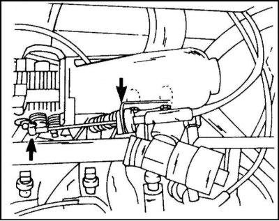 4. Отсоедините трос привода дроссельной заслонки от шарнирной головки и от опоры. Крепление его показано на иллюстр.