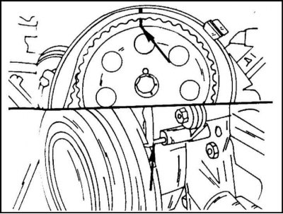 12. Установите поршень цилиндра №1 в ВМТ. Для данного типа двигателя сделать это необходимо точно. Углубление в распределительном вале должно находиться в положении, показанном на иллюстр. Кроме того в маховике имеется шарик, который должен находиться напротив штифта в блоке цилиндров.