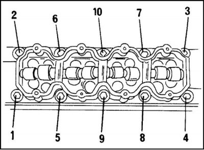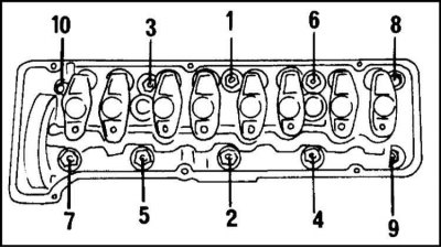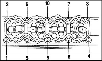 13. Отверните болты крепления головки цилиндров за несколько приемов в последовательности, показанной на иллюстр. За первый прием отверните болты не более, чем на четверть оборота, за второй прием на пол-оборота. Для отворачивания используйте торцевой ключ.