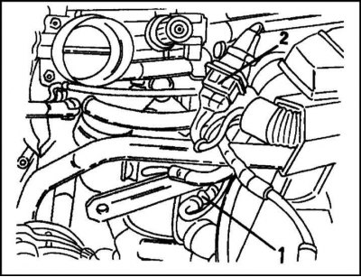 2. Расстыкуйте оба штекерные соединения, показанные на иллюстр. Это соединение датчиков температуры охлаждающей жидкости (1) и положения коленчатого вала (2).