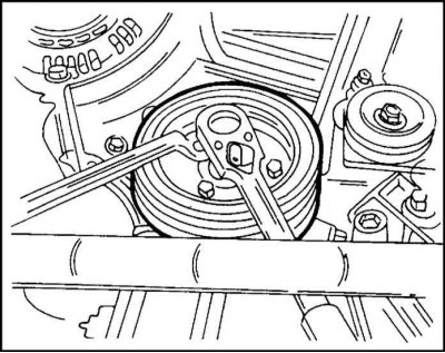 16. Все прочие работы выполняются в последовательности, обратной разборке. В заключение натяните ремень привода генератора и насоса гидроусилителя руля. Болты крепления демпфера крутильных колебаний затяните моментом 20 Нм, удерживая коленчатый вал от проворачивания.