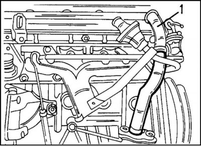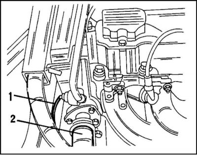 8. Расстыкуйте штекерное соединение датчика температуры охлаждающей жидкости (1) и отсоедините верхний шланг охлаждающей жидкости (2) от выпускного штуцера. Места расположения соединений показаны на иллюстр.