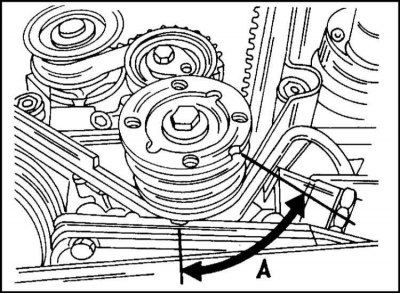 9. Следующая операция должна быть выполнена перед снятием зубчатого ремня. Вставьте торцевую головку в центр шкива коленчатого вала и проверните его в направлении вращения так, чтобы вал занял положение, показанное на иллюстр. Угол "А" должен составлять 60°.