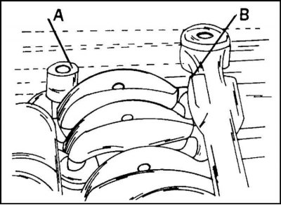 16. Отверните болты крепления головки цилиндров равномерно по спирали снаружи внутрь. Сначала на четверть оборота, а затем на пол-оборота. Для отворачивания болтов следует применять прочный торцевой ключ-шестигранник. Для отворачивания двух задних болтов необходимо применять шестигранник на 10 мм разной длины. Болт (А = правая сторона), показанный на иллюстр., отворачивается ключом, длиной 73 мм, болт (В = левая сторона) – ключом длиной 103 мм.