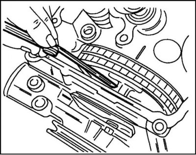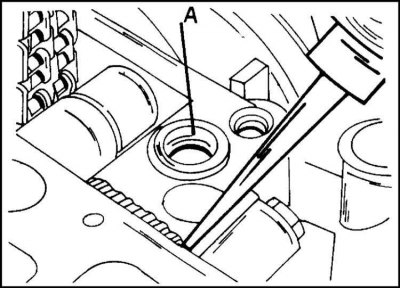 1. Сопрягаемые плоскости корпуса подшипников механизма распределения и блока цилиндров покрываются герметиком. Фирма Opel использует для этого герметик № 1503294, продаваемый в тюбиках. Герметик наносится валиком шириной 3 мм в месте, показанном на иллюстр. В этом месте имеется углубление, куда вставляется резиновое уплотнительное кольцо. Сальник (А) замените.