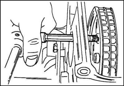 14. Выверните из распределительного вала пластмассовый ограничительный винт подачи топлива и снимите зубчатое колесо, удерживая распределительный вал от проворачивания. Для этого требуется многошлицевой ключ, который вставляется так, как показано на иллюстр.