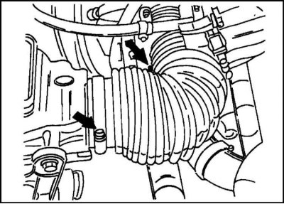 3. Ослабьте крепление обоих хомутов, показанных стрелками на иллюстр. и снимите шланг всасывания воздуха.
