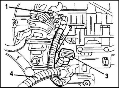 У нового двигателя шланг вентиляции картера выведен не к картеру, а к крышке подшипников распределительного вала. Прокладка шлангов показана на иллюстр. пункта 4а. Установленный на старой модели двигателя распределитель зажигания заменен у нового двигателя модулем зажигания. Корпус подшипников распределительного вала закрывается картонной прокладкой. Это исключает применение сальника распределительного вала (иллюстр. пункта 4b).