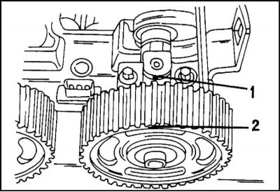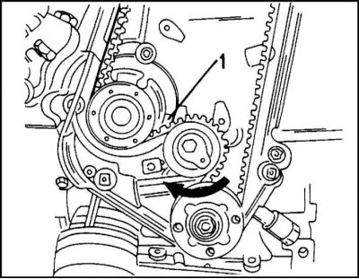 10. Теперь снимите зубчатый ремень. Для этого ослабьте болт крепления натяжного ролика и поверните регулировочный эксцентрик в направлении стрелки (по часовой стрелке) так, чтобы указатель (1) на иллюстр. находился напротив левого упора. Теперь осторожно отделите зубчатый ремень от зубчатого колеса распределительного вала.