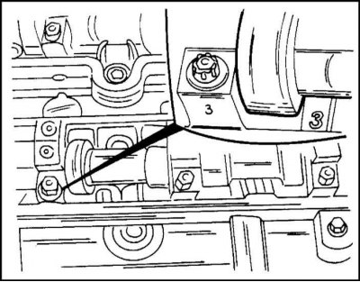 16. Отверните болты крепления и снимите грузозахватную скобу (транспортировка двигателя) с корпуса подшипников распределительного вала.