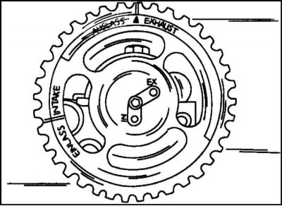 10. Следующая операция важна и должна быть выполнена перед снятием зубчатого ремня. Вставьте торцевой ключ в центр шкива коленчатого вала и проверните коленчатый вал по направлению вращения так, чтобы он и распределительный вал заняли положение, показанное на иллюстр. (распределительный вал - вверху, коленчатый вал - внизу). Метка на колесе распределительного вала должна совпасть с меткой на планке, штифт на нижней стороне должен находиться напротив метки коленчатого вала.