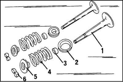 5. Снимите щипцами опорные шайбы пружин. Все детали тщательно очистите и проверьте, как описано в подразделе "Ремонт головки цилиндров". При необходимости детали замените.
