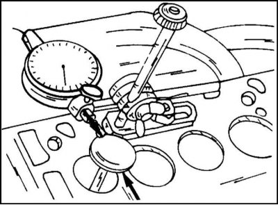 1. Проверьте все седла на наличие следов износа и каких-либо повреждений. Небольшие следы износа можно устранить фрезой с углом 45°. Если седла имеют значительный износ, их необходимо фрезеровать. Следует иметь в виду, что седла не должны слишком глубоко врезаться в головку цилиндров. Для этого клапан вставляется в отверстие и с другой стороны измеряется длина выступающей части стержня клапана специальным калибром.
