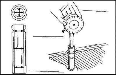 3a. Подвигайте рукой тарелку клапана и снимите показания индикатора. Если индикатор показывает отклонение более 1.0 мм у впускного и более 1.3 мм у выпускного клапана, то в большинстве случаев это указывает на необходимость замены направляющей. Более точные результаты дает измерение внутреннего диаметра направляющей и наружного диаметра стержня клапана с помощью микрометра, как показано, соответственно на иллюстр. 3a и 3b в нескольких сечениях и направлениях.