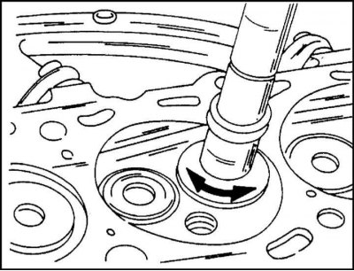 8. Направляющая выпрессовывается из головки цилиндров со стороны камеры сгорания с помощью оправки. Оправка должна иметь на конце проточку, диаметром равным внутреннему диаметру направляющей.