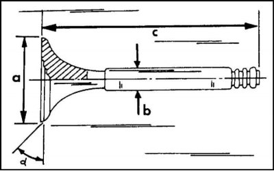 1. Измерьте параметры клапанов, указанные на иллюстр (a = диаметр тарелки клапана, b = диаметр стержня клапана). В случае несоответствия заданным значениям клапаны замените на новые. Имейте в виду отличия между впускными и выпускными клапанами. Необходимые данные приведены в Спецификациях.