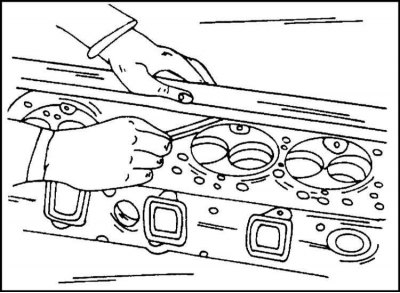 Тщательно очистите поверхности головки и блока цилиндров и проверьте плоскостность их поверхностей стальной линейкой, как описано ниже.
