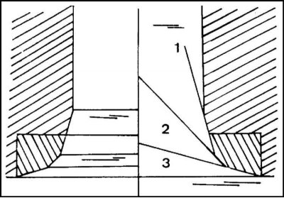 - слегка фрезеруйте верхнюю кромку седла под углом 15°, а нижнюю под углом 60° так, чтобы ширина рабочей фаски седла впускного клапана составляла 1.0–1.5 мм, а выпускного 1.7–2.2 мм.